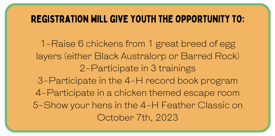 - Show your hens in the 4-H Feather Classic on October 7th, 2023