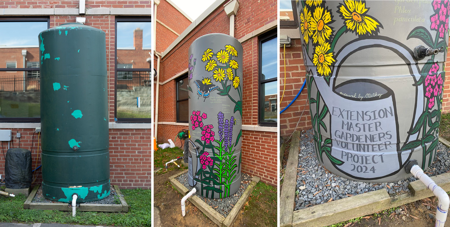 As the project commenced, Extension Agent Ashley Troth, Project Organizer Lisa Nadler and Artist Dave Milkereit were joined by eleven Master Gardeners to transition the unappealing surfaces of the cisterns into beautiful, educational, works of art.